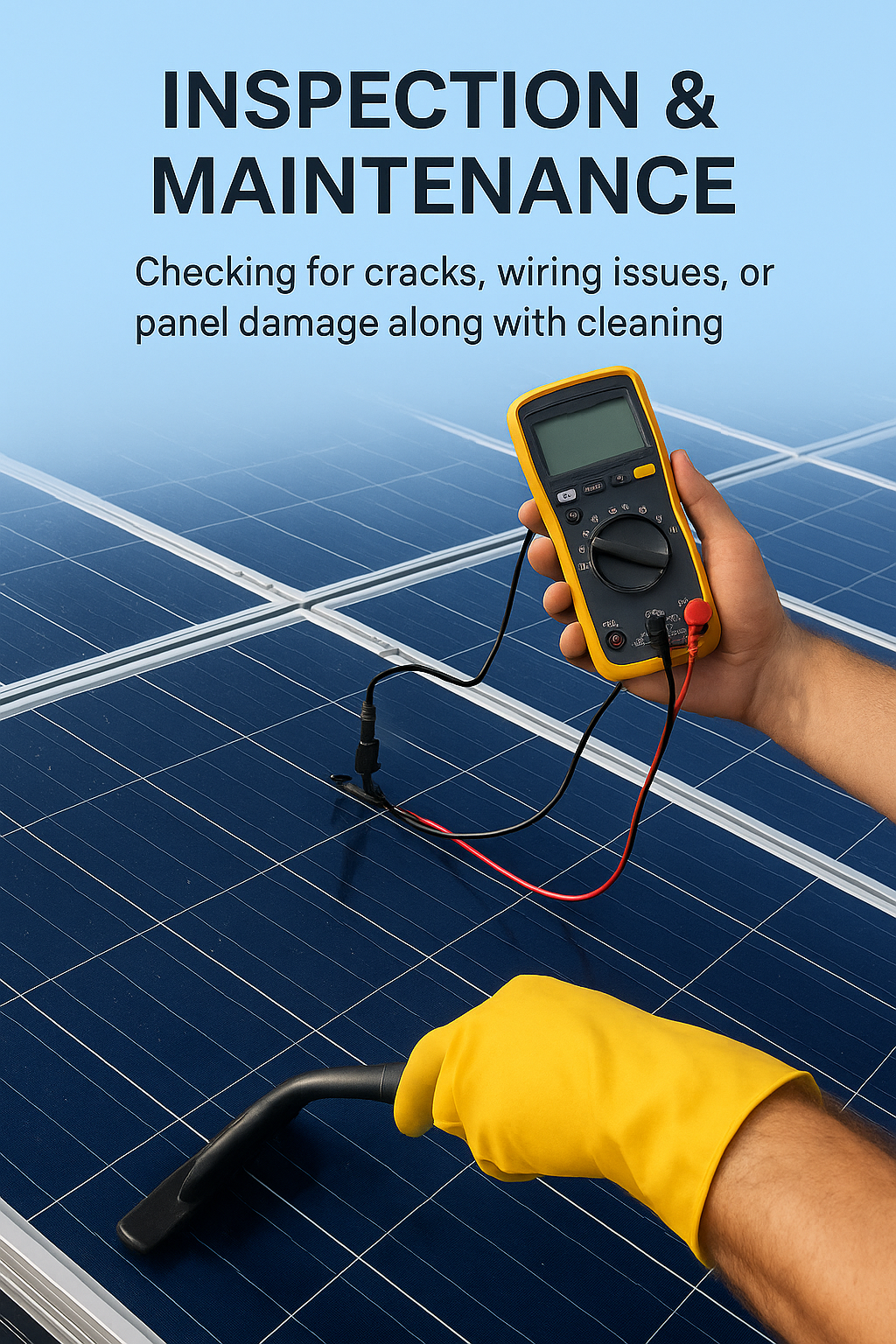 Inspection & Maintenance keeps your solar panels safe and efficient. We carefully check for cracks, wiring faults, and panel damage. Along with cleaning, we ensure your system runs smoothly. This service helps prevent costly repairs and improves panel lifespan.