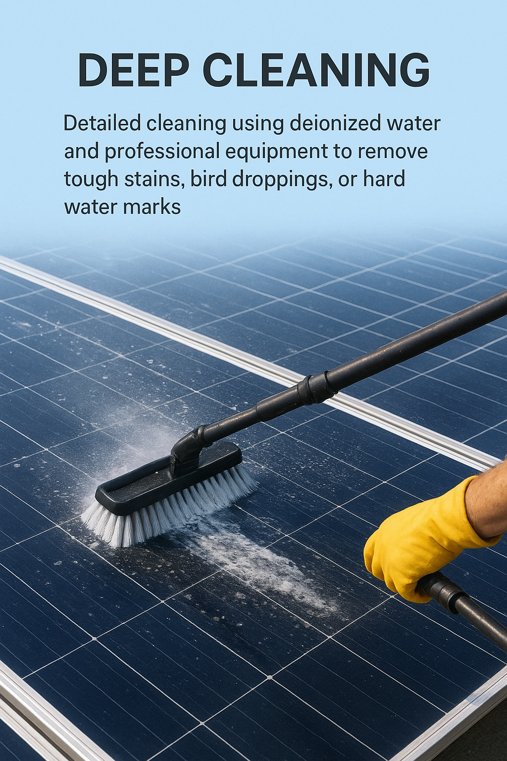 Deep Cleaning ensures maximum solar efficiency by removing stubborn dirt, bird droppings, and hard water stains. We use deionized water and advanced professional equipment for spotless results.